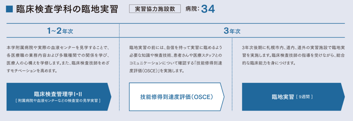 1年次には本学の附属病院での見学実習を通して、医療人の心構えを学びます。2年次には大学病院や血液センターなどの実際の検査室を見学。臨床検査技師をめざすモチベーションを高めます。3年次には札幌市内の総合病院を中心に、本学の附属病院、道内各地の実習施設で臨床実習を実施。必要な技能・態度を備えていることを確認する「技能修得到達度評価」を導入するなど、体系的な実習教育を行います。