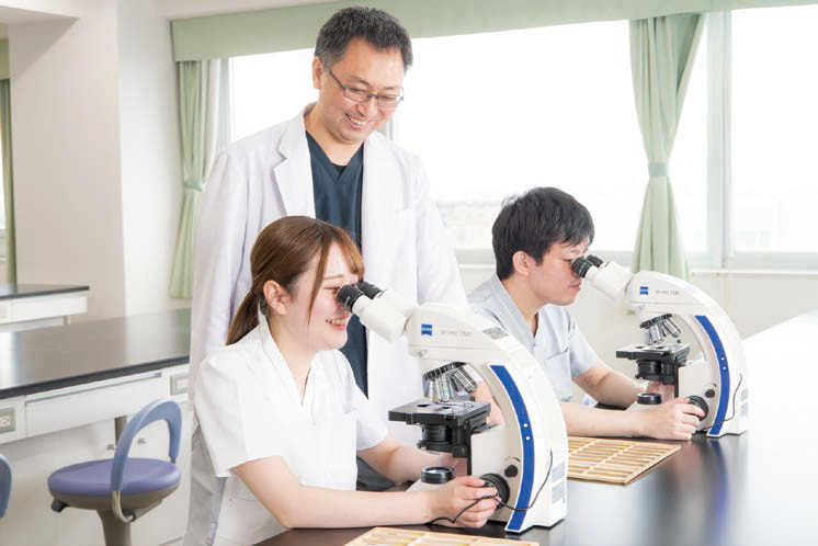 学内にはエコーや自動分析装置など現場同等の設備を備え、質量分析機やバーチャルスライドシステムも導入しています。3年次には道内外の病院で臨地実習を行い、段階的な学びを通して実践力を養い、医療現場で活躍できる人材を育成します。