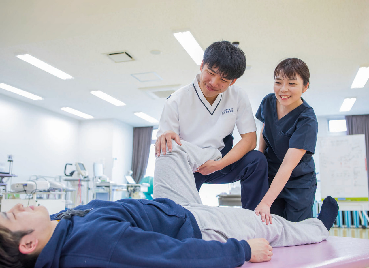 筋力や関節可動域など身体機能の検査・測定方法を学ぶ科目もスタート。地域住民の方々が模擬患者として協力する医療面接演習もあります。