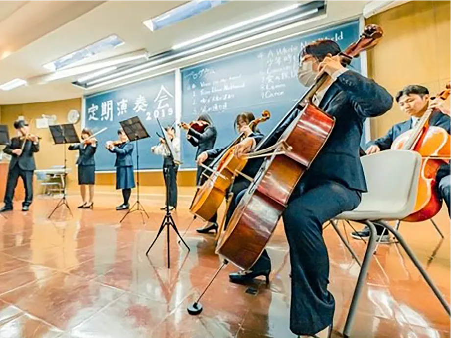 弦楽器は難しいと思うかもしれませんが初心者でも一ヶ月ほどあれば簡単な楽曲を弾けるようになります。(楽器は学校のものを使用できますので、新たに揃える必要はありません)現に部員のほとんどが大学で弦楽器を始めた人たちです。初心者も経験者も大歓迎です! 見学だけでも気軽に来てくださいね!