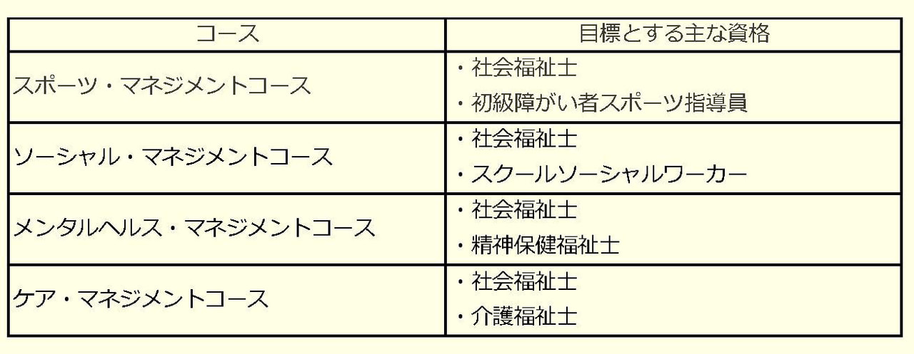 福祉関連の資格を持ちながら、地域医療、スポーツ、メンタルヘルス、企業・経営のマネジメントなどの専門性も兼ね備え、幅広い分野で活動できる新時代の福祉専門職をめざします。