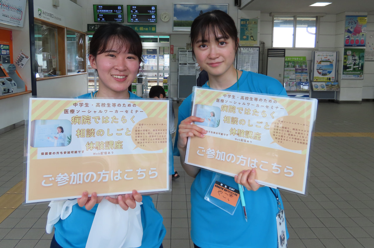 医療機関などで、病気になった患者さんやそのご家族に寄り添いながら社会福祉の立場から支援する福祉の専門職「医療ソーシャルワーカー(MSW)」に焦点を当てたもので、北海道医療大学病院を舞台に、ロールプレイングで相談援助の仕事について学び、医師や薬剤師、看護師、理学療法士、歯科衛生士など多職種から情報を収集する体験など、普段はあまり目にすることのできない病院内でのチーム医療の一部を見ることができるプログラムとなっていました。