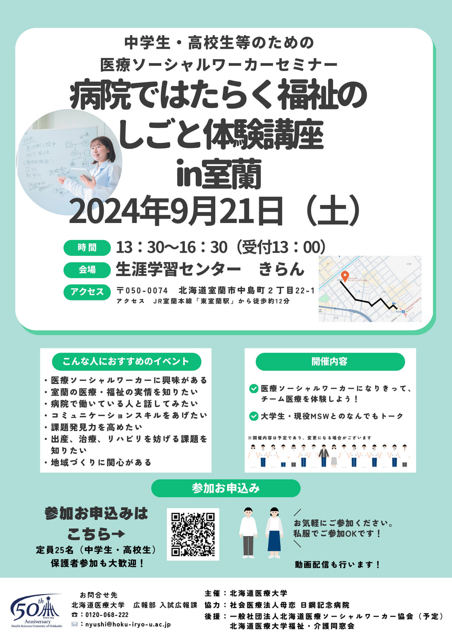 病院ではたらく福祉のしごと体験講座in室蘭【9/21(土)開催】