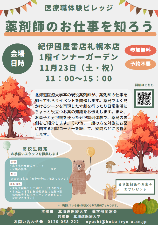 本学薬学部同窓会主催の薬剤師の職業を紹介するイベントを開催します。