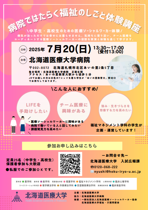 7月20日(日)に「病院ではたらく福祉のしごと体験講座」を北海道医療大学病院で開催します。