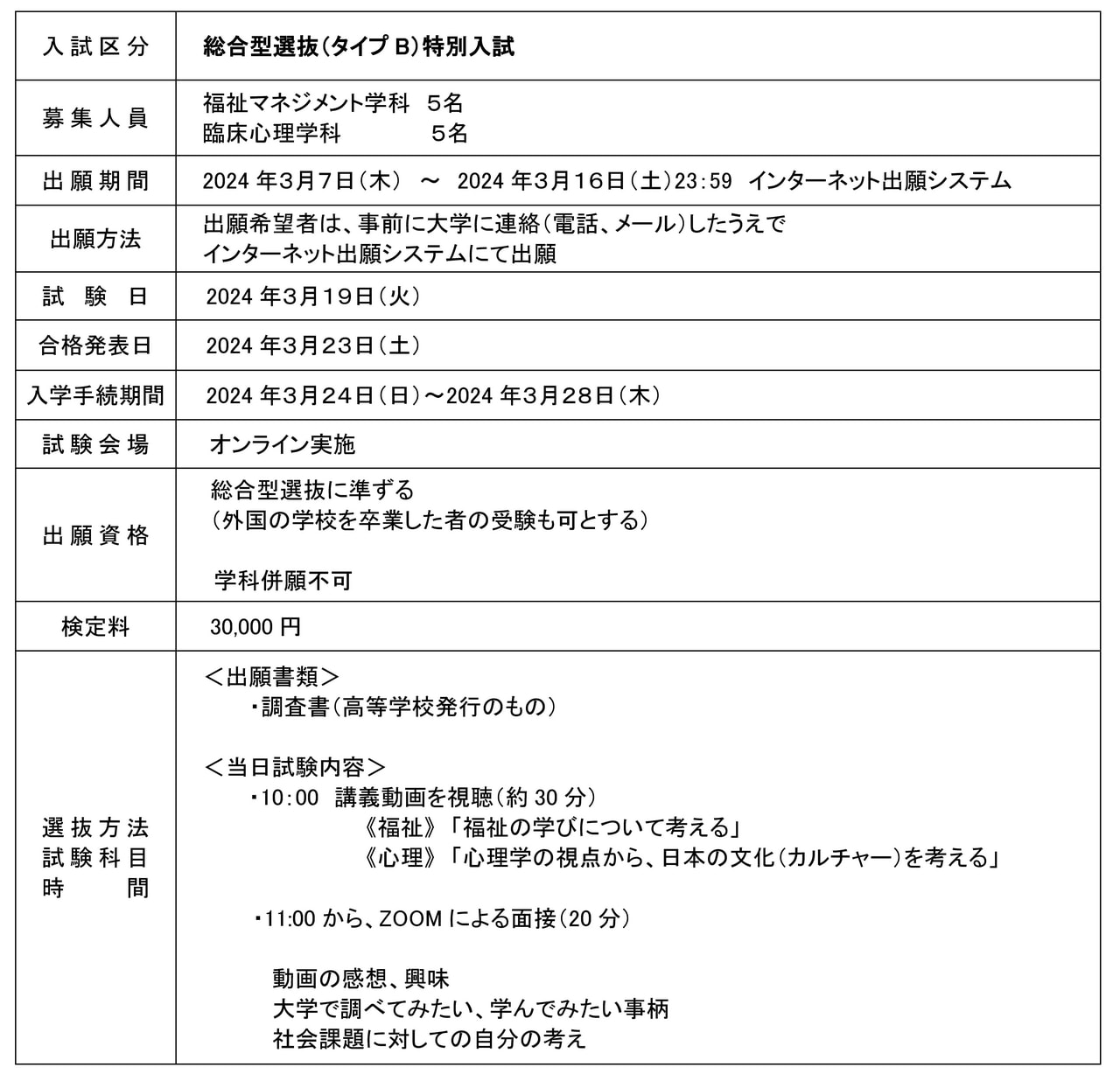 臨床心理学科と福祉マネジメント学科では、総合型選抜(タイプB)特別入試を下記の要領で実施します。