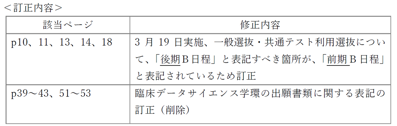 「2026年度学生募集要項」につきまして、一部記載内容に誤りがございましたので、以下のとおり訂正しお詫び申し上げます。試験日程・会場、試験科目に関する変更はございません。また、本学受験生応援サイトに掲載している募集要項については、訂正したものに差し替え済みです。