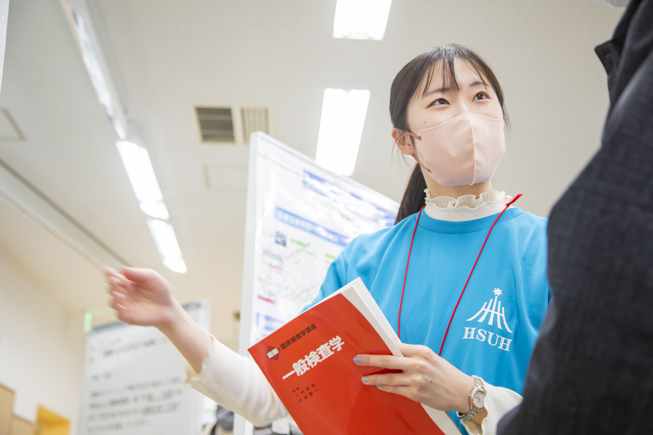 大学概要説明のあと、薬学部卒業生によるチーム医療の説明を行い、本学における多職種連携教育や大学の雰囲気を知ってもらうためのプログラムとして、当別キャンパスでは全学部学科のブース見学を実施しました。学科別のプログラムでは、各学科で普段使用する講義室や実習室などで在学生とのライブトークや体験実習、学内見学などを行いました。また、保護者の方向けにそれぞれの学科の特徴などを含めた学修サポート体制などを説明し、学科プログラム終了後は、2025年度の入学者選抜の概要説明を行いました。