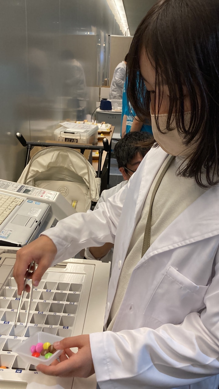 本イベントは、小学生・中学生・高校生向けの体験コンテンツと、一般の方向けにお薬やお口の相談コーナーを設け、幅広い年代の方に楽しみながらそれぞれの職種について知っていただくため、北海道薬剤師会・札幌薬剤師会・北海道歯科医師会・北海道歯科衛生士会の後援のもと、企画しました。 薬剤師体験として、お菓子を錠剤に見立てた分包調剤や、疑似軟膏を用いた外用薬の混合調剤を体験するコーナーを設置しました。さらに、実際に大学で使用する実験器具を用いてアロマスプレー作りも体験できるコーナーも設置し、大学での学びの一部を体験していただきました。また、歯科医師・歯科衛生士体験として、毎年当別キャンパスにて実施している小学生の1日歯医者さん体験(事前予約制)や指の印象採得・むし歯の治療体験・歯磨き圧測定体験・口腔清掃用具体験ができるコーナーを設置しました。体験の参加者には白衣を着ていただき、職種になりきって真剣に手を動かしている姿が見られました。