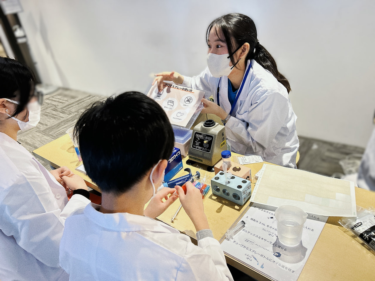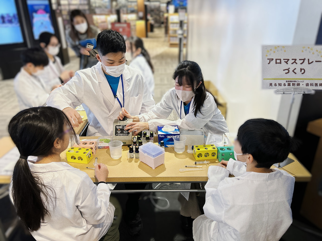 当日は小学生から高校生までたくさんの参加者に薬剤師や歯科医師のお仕事を体験していただきました。薬剤師の体験ではお菓子を使った分包体験、アロマオイルを使ったアロマスプレーづくり体験を用意し、歯科医師の体験では義歯を使った虫歯の治療体験を用意しました。
