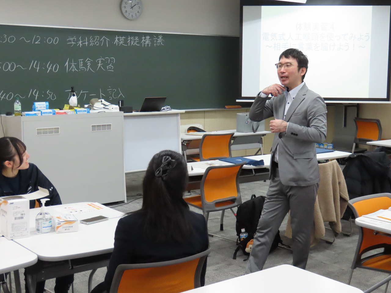 札幌市内の高等学校7校(旭丘高等学校・開成中等教育学校・清田高等学校・啓北商業高等学校・新川高等学校・平岸高等学校・藻岩高等学校)の参加生徒27名の希望に沿って、看護師・理学療法士・作業療法士・言語聴覚士をめざす学びを体験する4つのコースから選択してもらい、それぞれの職業をめざす学科の紹介や模擬講義と実習を体験しました。看護師のコースでは、看護職の中でも高齢者への看護について学ぶ模擬講義と、赤ちゃん人形や車椅子を使った体験など、幅広い世代への看護の仕事を体験しました。理学療法士のコースでは、理学療法士の職域やめざすための学びについて紹介し、実際に動作分析やバリアフリーラボを使って日常生活におけるリハビリ体験をしました。作業療法士のコースでは、理学療法士と作業療法士のちがいや作業療法士の職域について学び、脳機能を計測するなどさまざまなリハビリを体験しました。そして言語聴覚士のコースでは、言語聴覚士が行う検査やリハビリについて紹介し、電動式人工喉頭などを使った対話体験などを行いました。