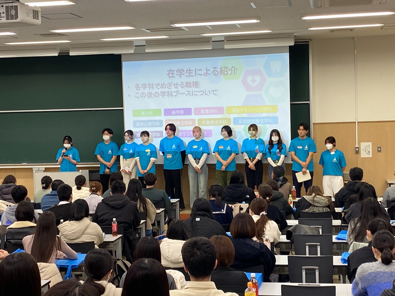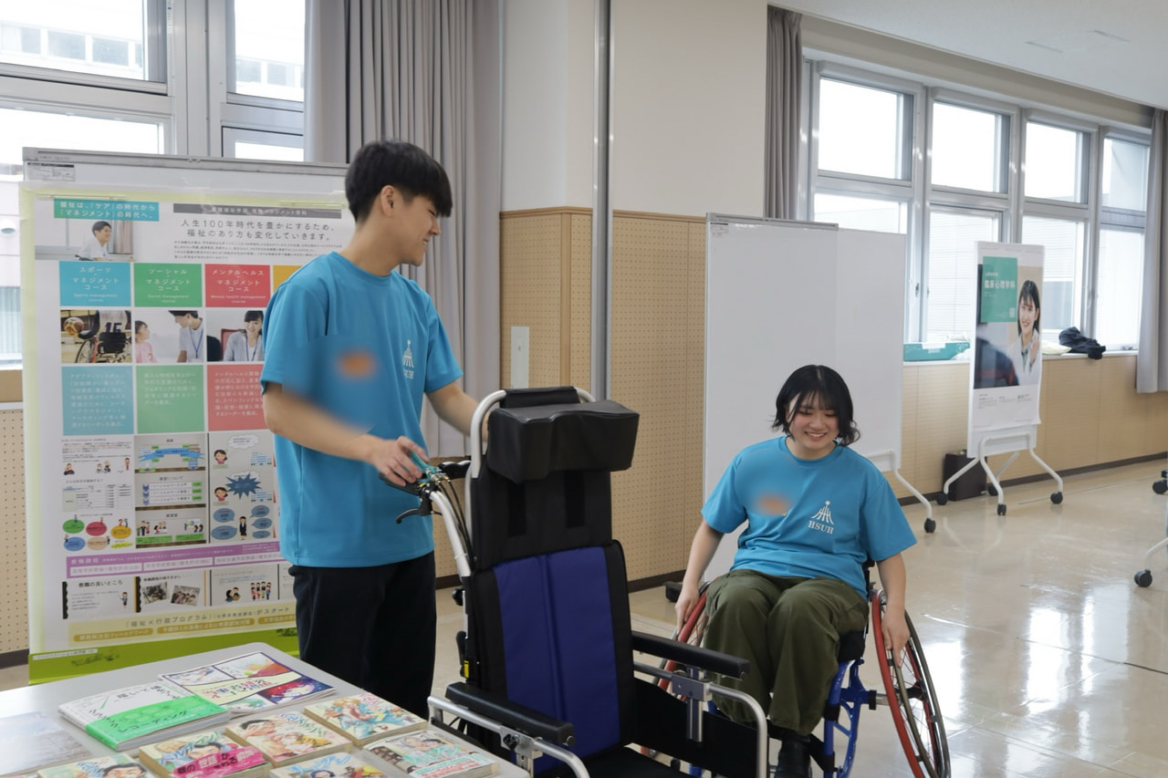 大学概要説明のあと、在学生による学科紹介・職業紹介を行い、本学における多職種連携教育や大学の雰囲気を知ってもらうためのプログラムとして、当別キャンパスでは全学部学科のブース見学を実施しました。学科別のプログラムでは、各学科で普段使用する講義室や実習室などで在学生とのライブトークや体験実習、学内見学などを行いました。また、それぞれの学科で独自の学修サポートや就職状況の説明など、保護者の方に向けたプログラムも実施しました。学科プログラム終了後は、2026年度の入学者選抜の概要説明を行いました。