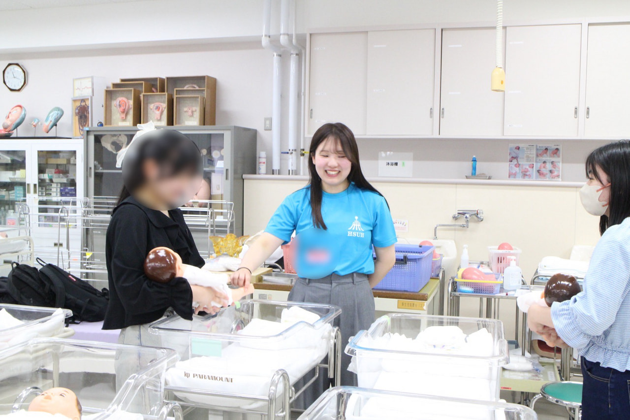 大学概要説明を実施後、学科別のプログラムでは、各学科で普段使用する講義室や実習室などで在学生とのライブトークや体験実習などを行いました。また、保護者の方向けにそれぞれの学科の特徴などを含めた学修サポート体制などを説明し、学科プログラム終了後は、学内ツアー・学祭体験、2026年度の入学者選抜の概要説明を行いました。